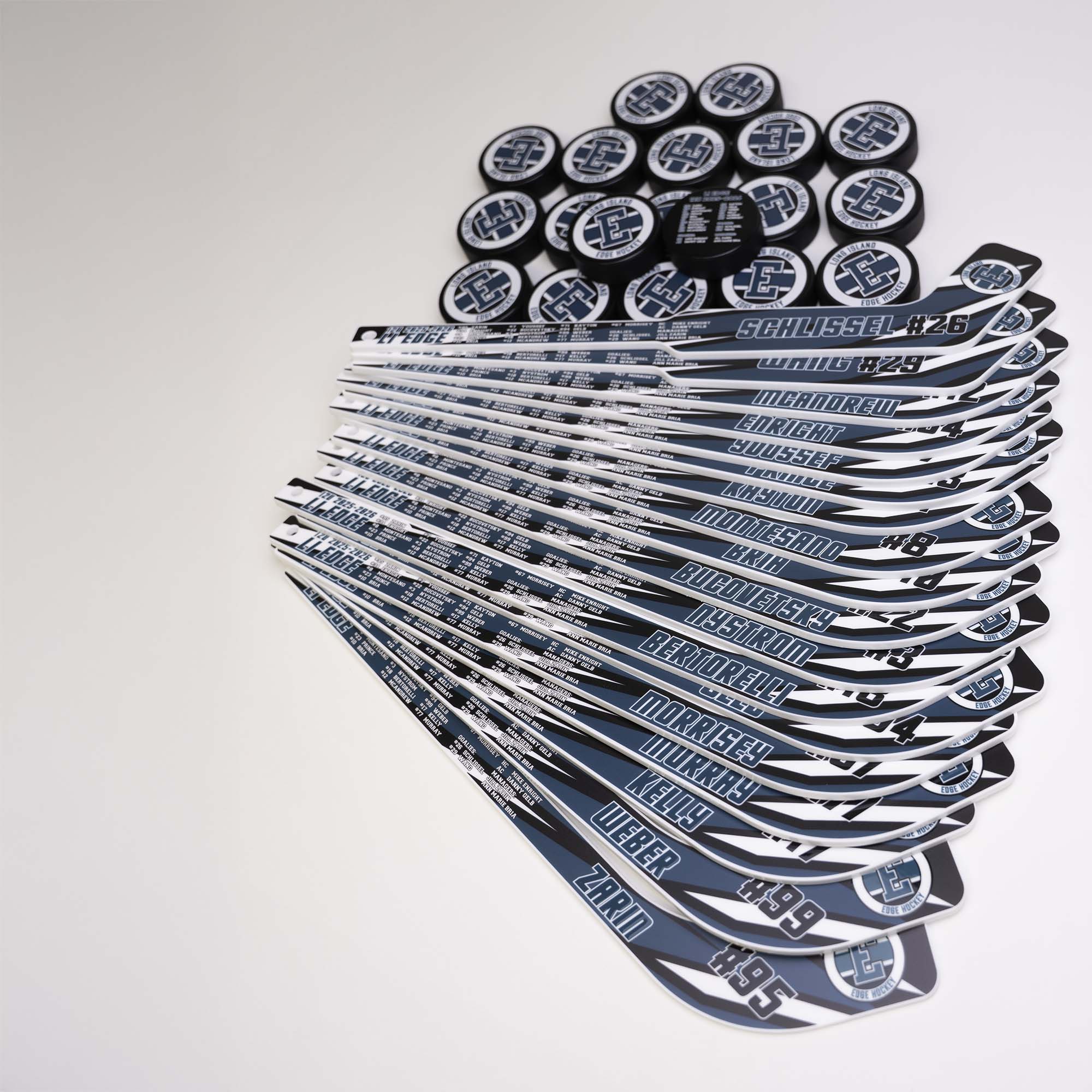 Customized Hockey Pucks, Mini Sticks for Teams and Coaches